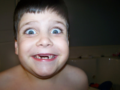 What else is a mother to think when a child loses 3 teeth in less than 24 hours? Two on top and one on bottom. He had previously lost his other top front tooth, so he was already looking pretty gummy. The picture at the top of this post was taken right after he lost the first one.